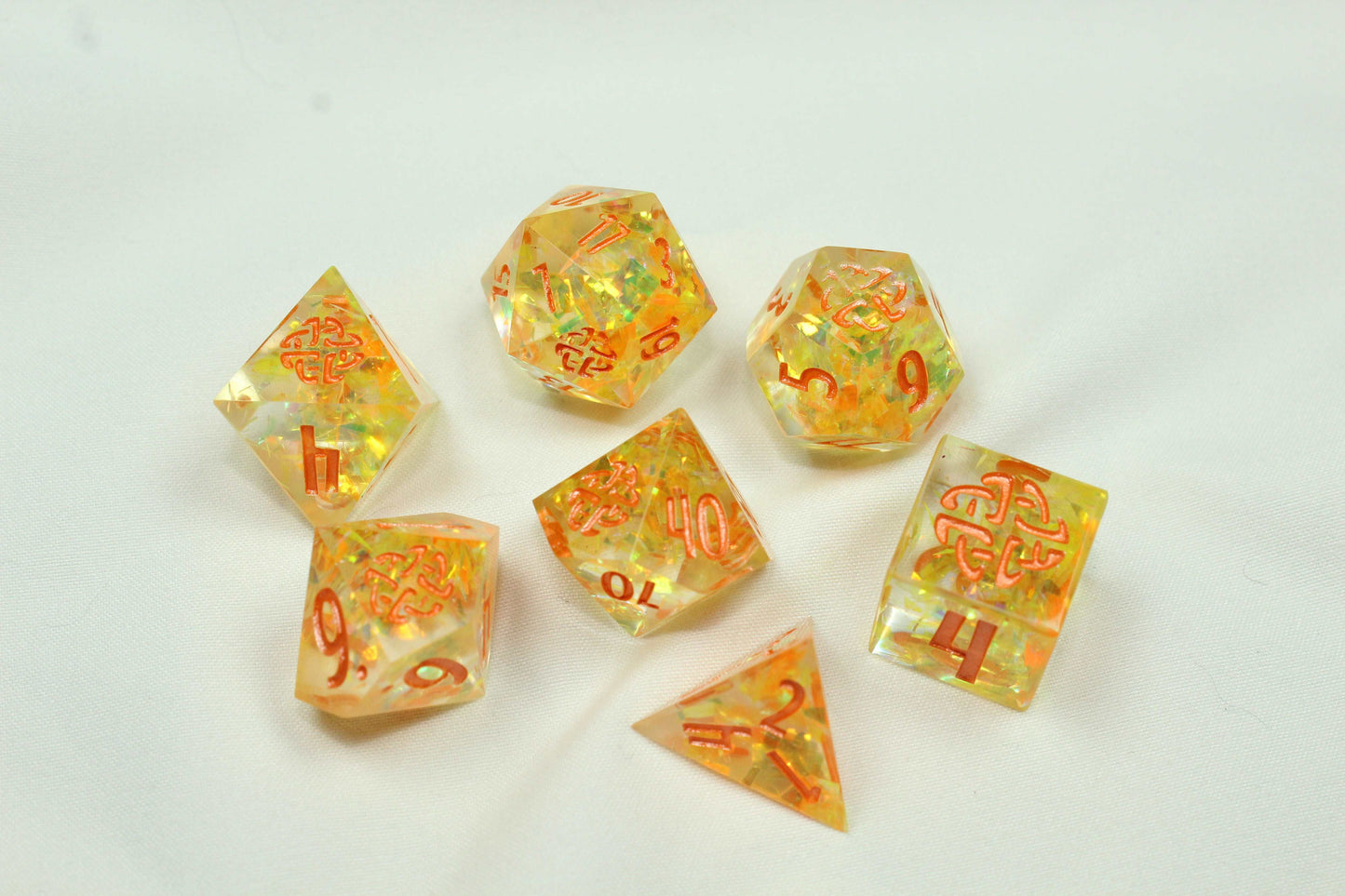 Add a twist to your game night with these funky orange dice! Roll with style and bring some zest to your tabletop adventures. Perfect for casual or serious gamers, these dice are sure to make the gameplay more exciting! (Pun intended)